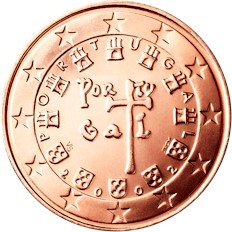 El centro de la moneda muestra una figura humana estilizada cuyo brazo izquierdo es prolongado por el símbolo del euro. Bajo este símbolo aparecen las iniciales del diseñador, ΓΣ (de Γε?ργιος Σταματ?πουλος, Geórgios Stamatópoulos). Las leyendas son, sobre el diseño, PORTUGAL; y bajo el diseño, UEM 1999-2009 (del portugués União Económica e Monetária, “Unión Económica y Monetaria”). La marca de ceca INCM (de Imprensa Nacional - Casa da Moeda, “Ceca Nacional - Casa de la Moneda”) se encuentra en el borde derecho. En el anillo externo aparecen las doce estrellas de la Unión. |